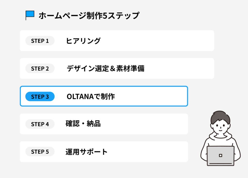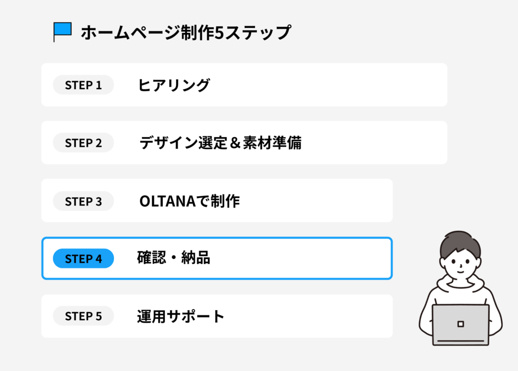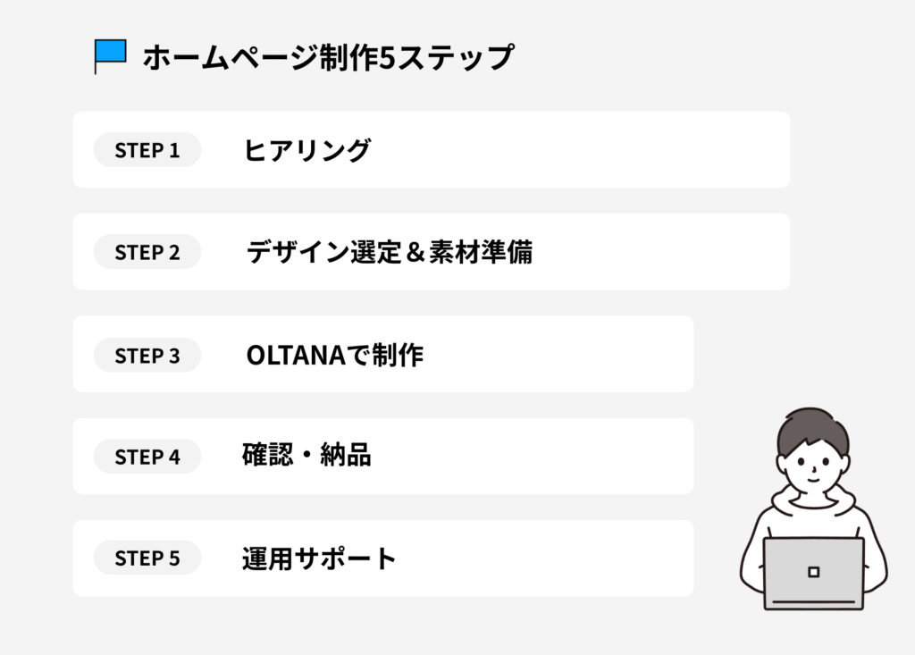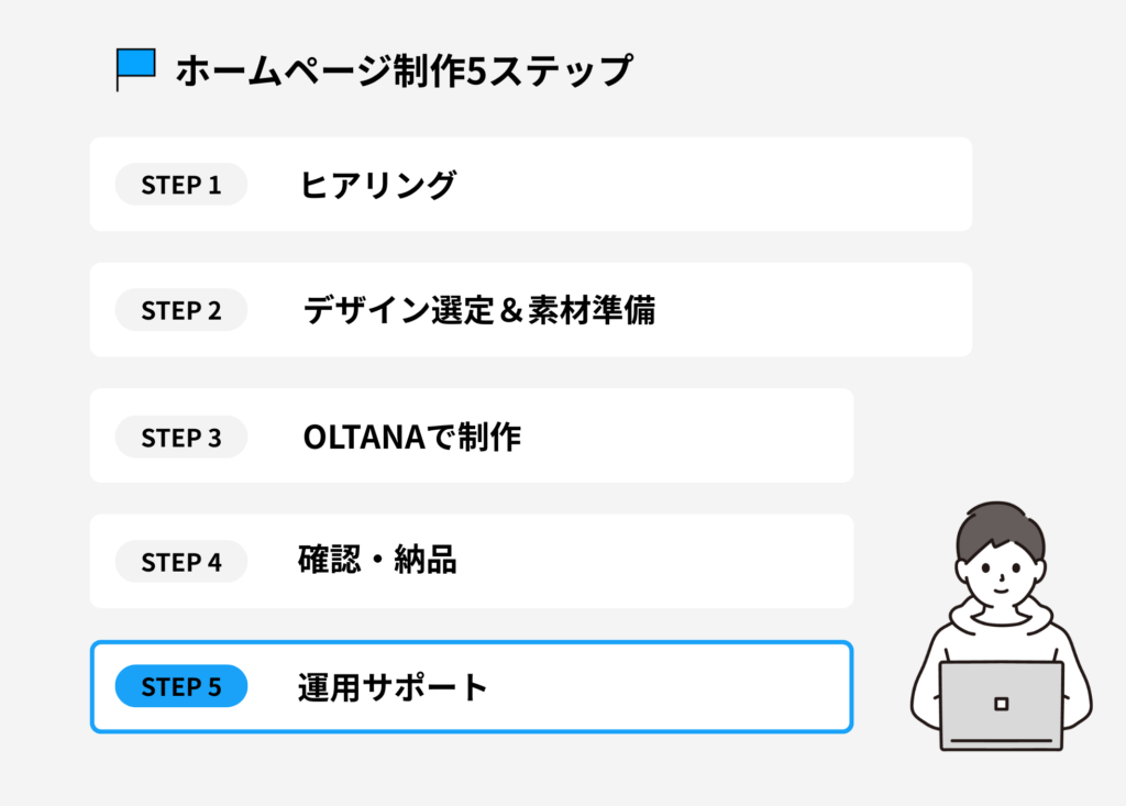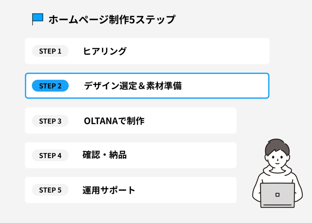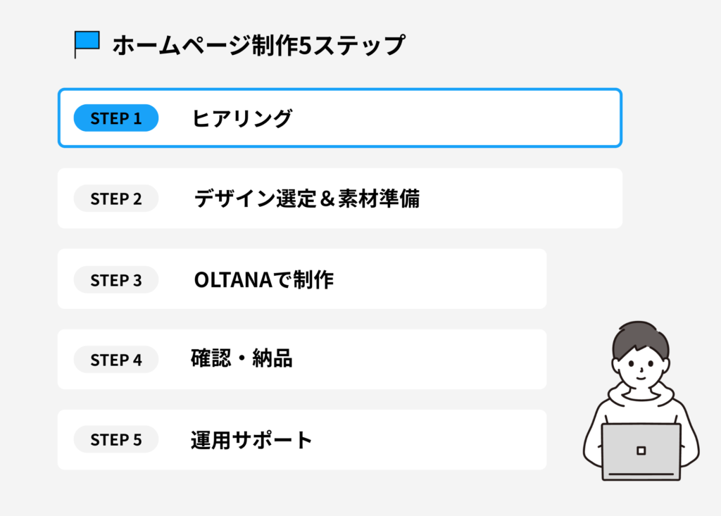 これから紹介する5ステップは、「ヒアリングから始まり、デザイン選定、制作、確認・納品、そして運用サポート」まで。