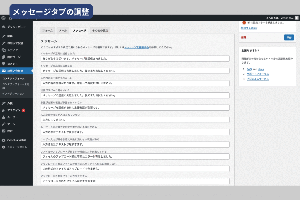 送信成功・エラー・必須項目の未入力などのメッセージをカスタマイズできます。