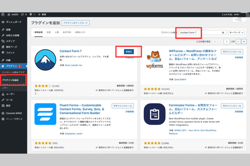 - 「Contact Form 7」で検索し、インストール → 有効化。