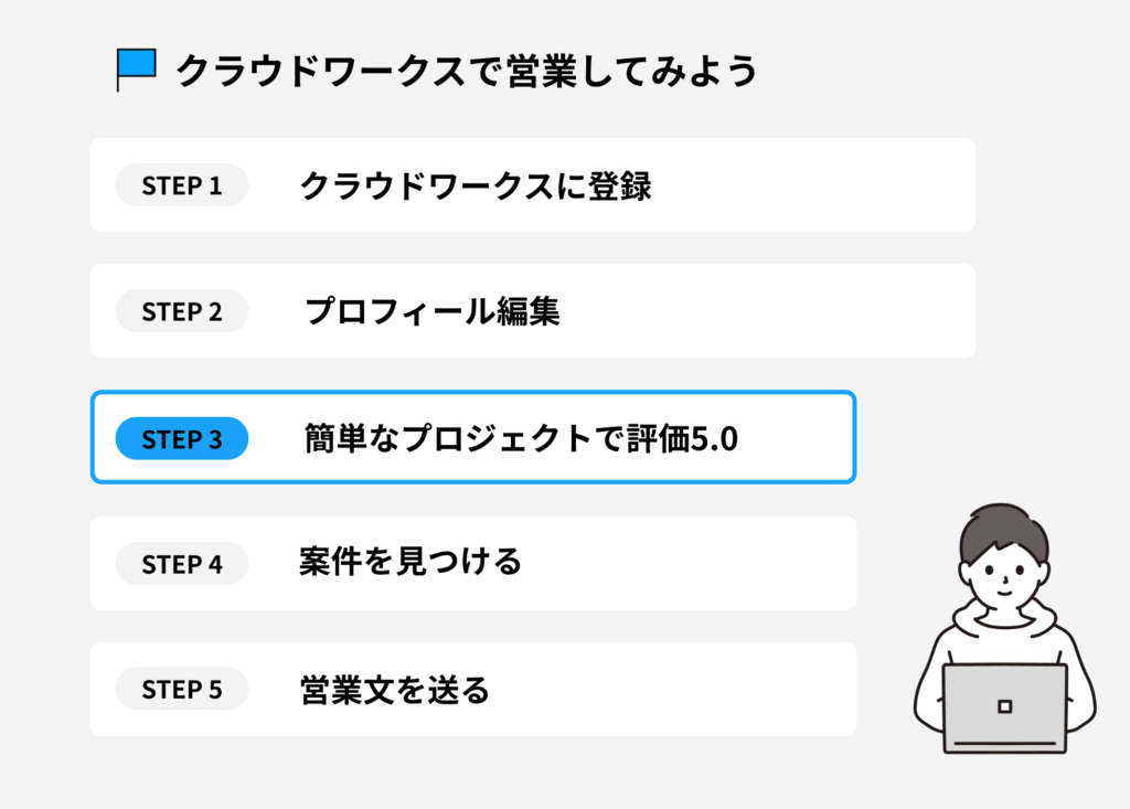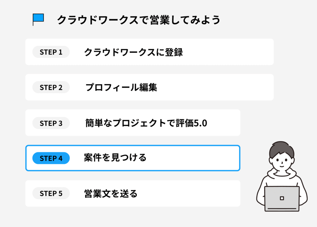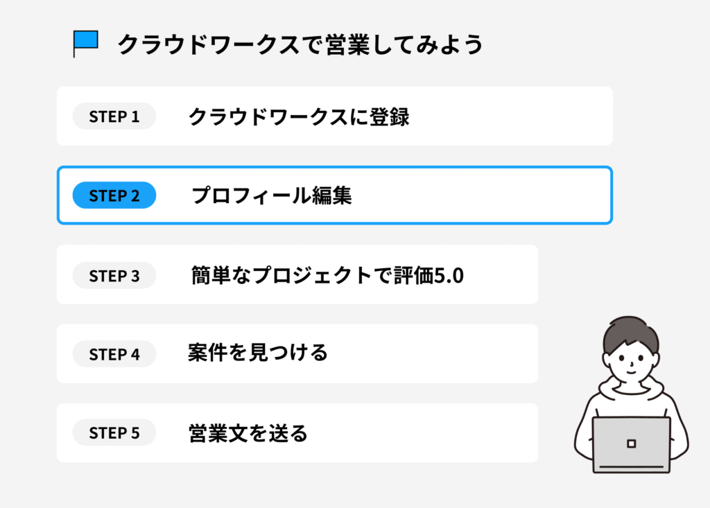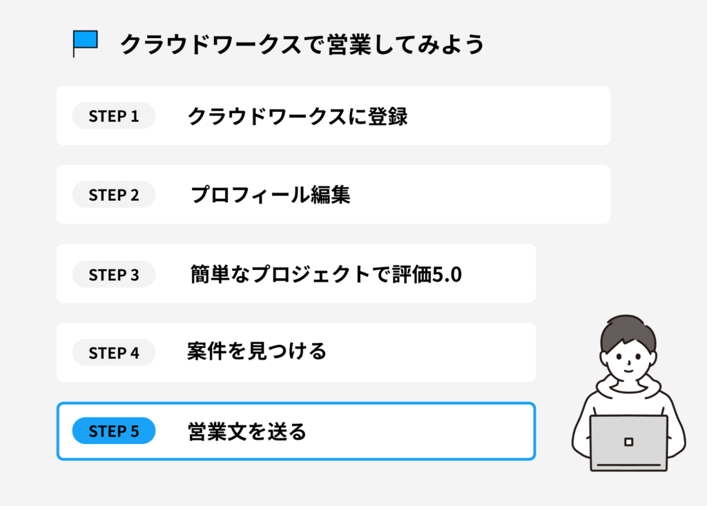 この5ステップを順に実践して、クラウドワークスでの「案件獲得」をしていきましょう。
