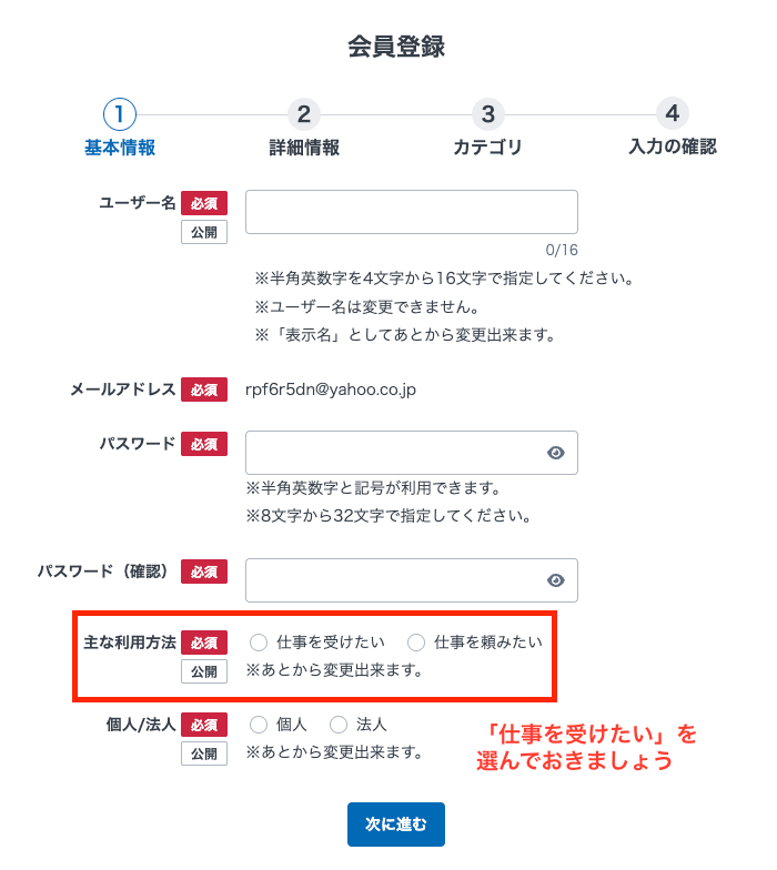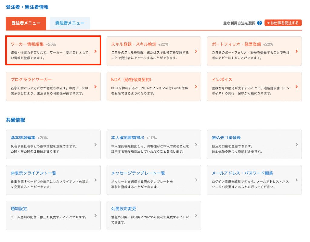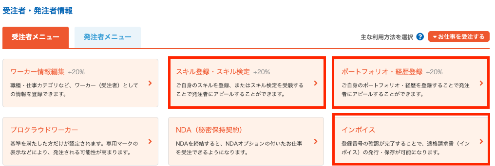 「お仕事を受けたい」を選んでおくと、案件検索や提案機能が使えるようになります。