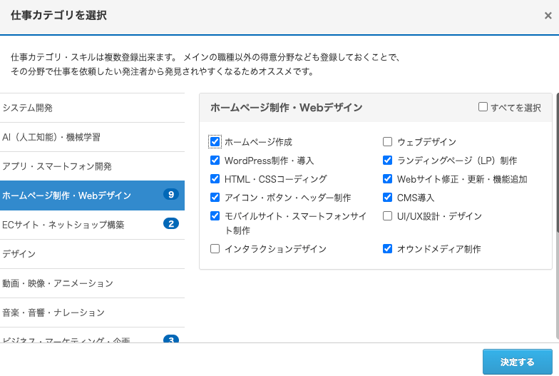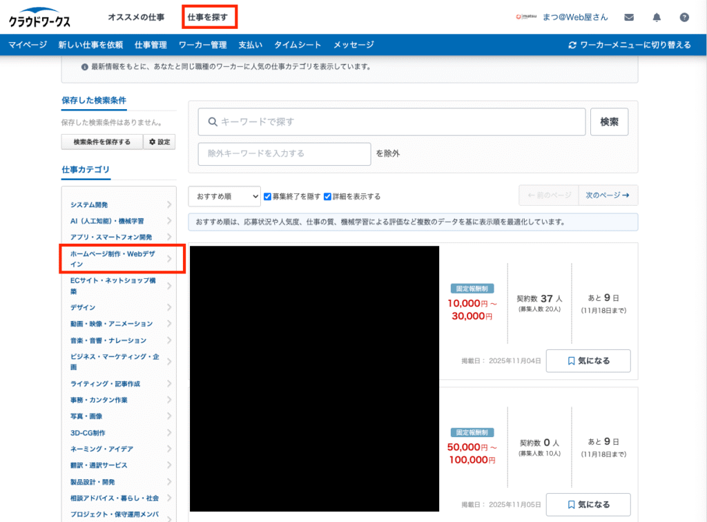 仕事カテゴリで「ホームページ制作・Webデザイン」を選ぶ