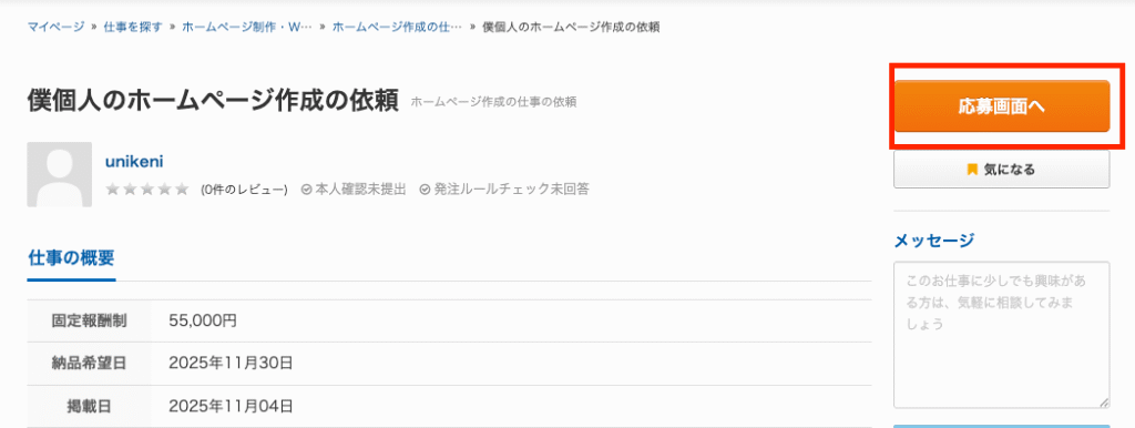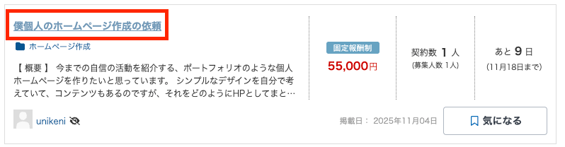 色々と見ていくと、個人ホームページを作りたいという案件を発見しました。