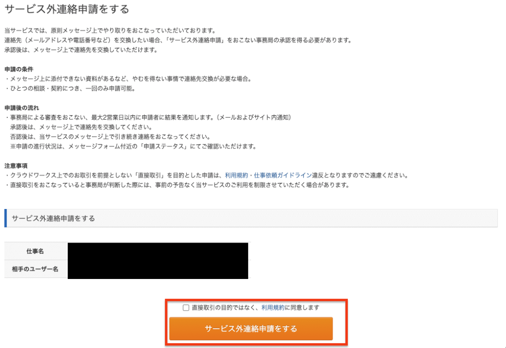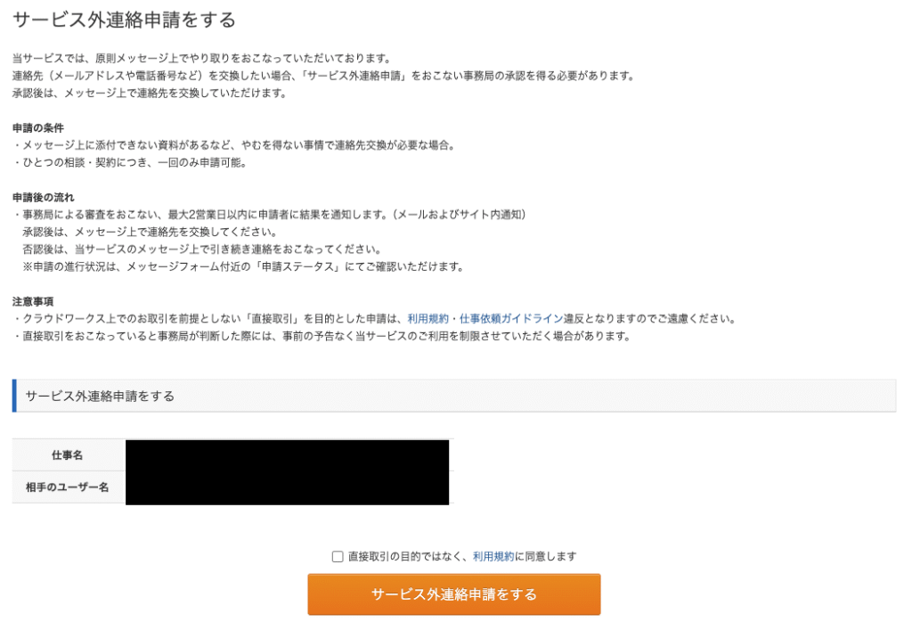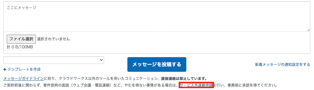 クラウドワークスでは、クラウドワークス以外のツールを用いたコミュニケーション、直接連絡は禁止しています。