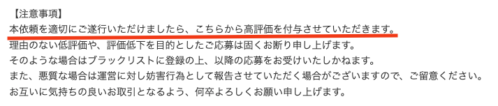 しかも、しっかり依頼をやれば高評価を付与しますと言ってもらってるわけですよ。