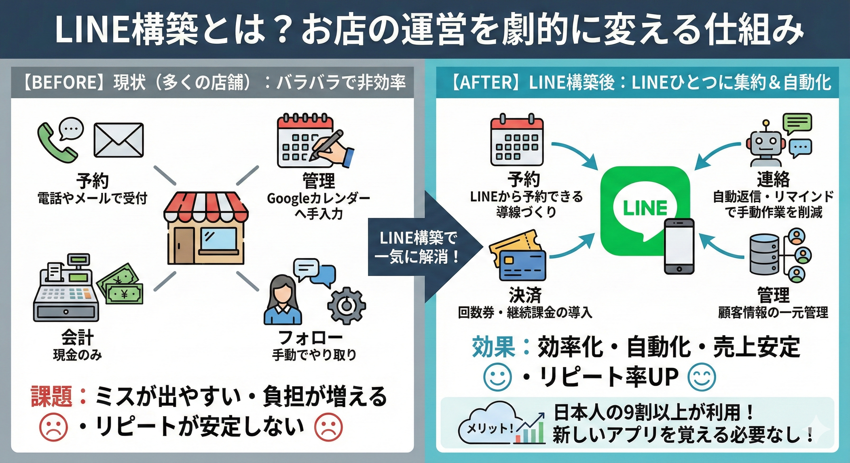 LINE構築は、予約・連絡・決済を一元化し、実店舗の運営を大きく改善できます。