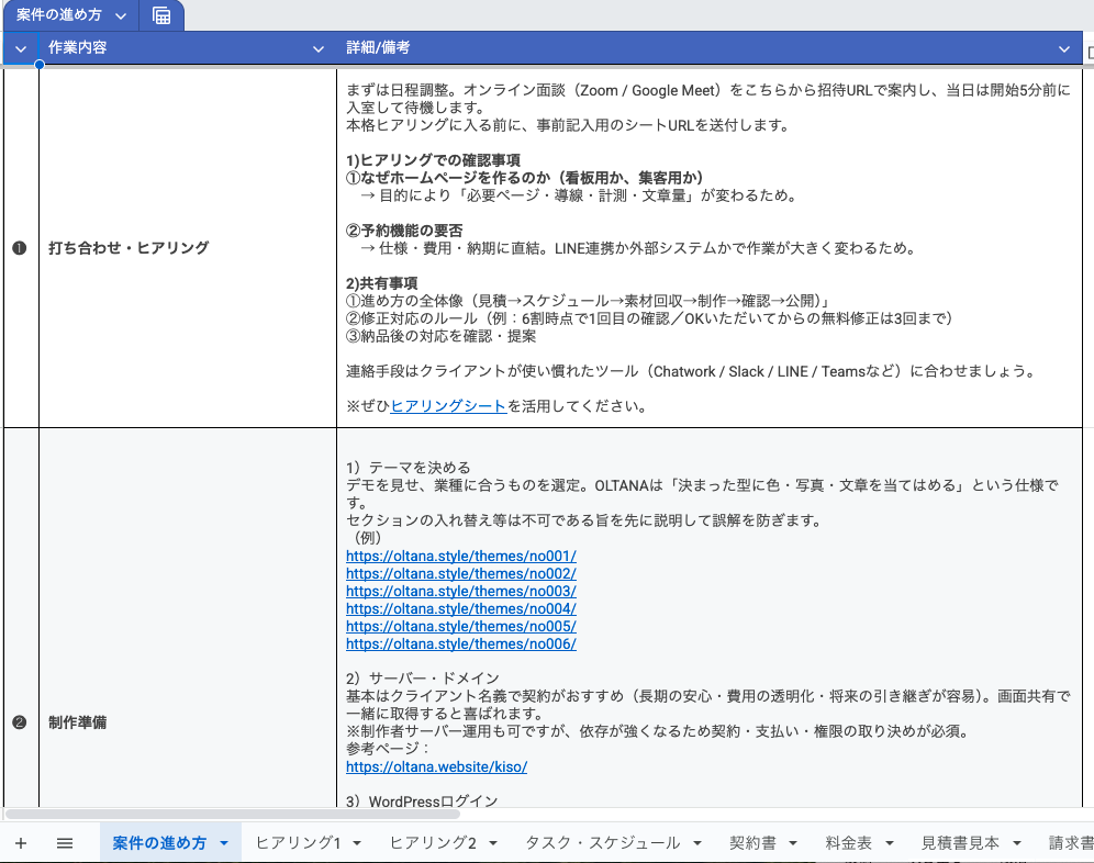 提案から納品までの流れを一つずつ整理してあり、このシートだけで制作業務を進められるように設計されています。
