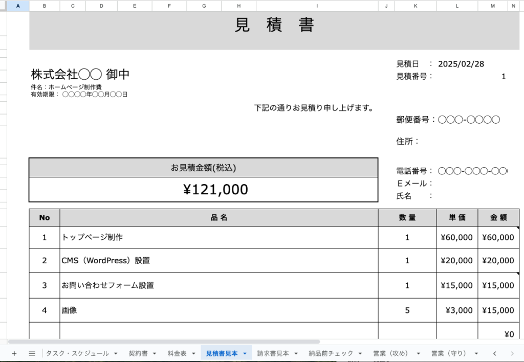 案件ごとに数字を差し替えるだけで見積書が完成します。