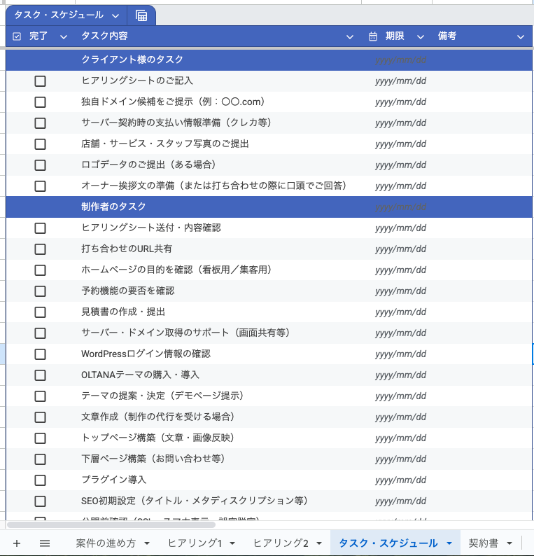 制作に必要な作業をリスト化し、制作者とクライアントで分担を決めます。