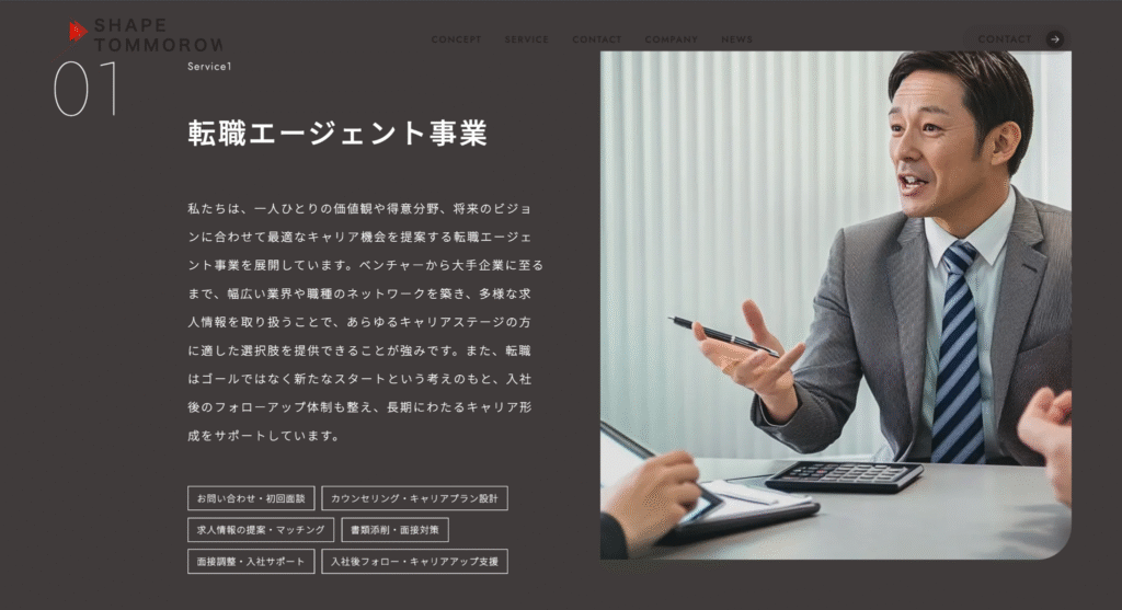 企業の理念と具体的なサポート内容が示されているので、利用者が自分に合ったサービスかどうかを判断しやすい構成になっていますね!