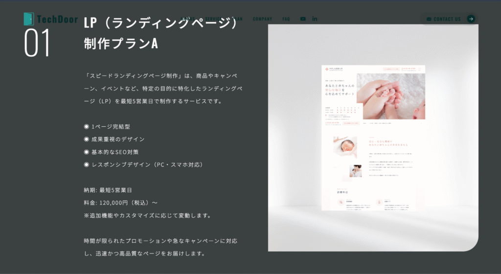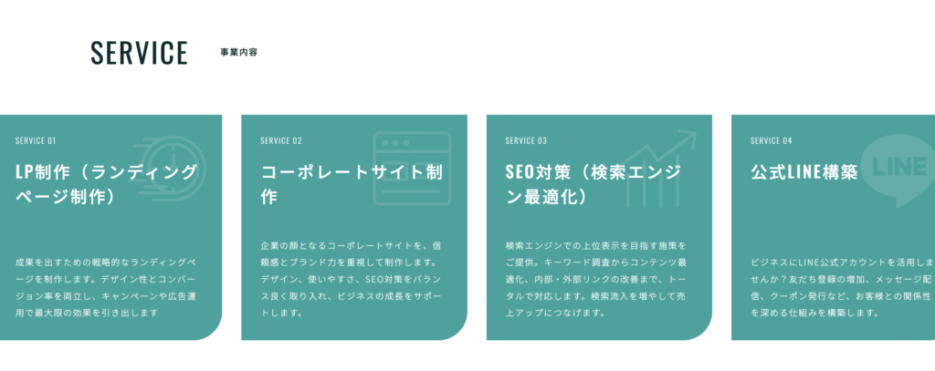 ホームページ制作に加えて、SEO対策やLP制作、LINE構築まで対応しているため、成果につながるまでのサポートを受けられることがわかりますね!